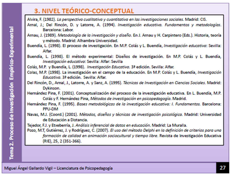 Hernández Pina, F. (2001). Conceptualización del proceso de de la investigación educativa. En M.P. Colás y L. Buendía Métodos de Investigación psicopedagogía. Madrid.